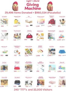 We are grateful to all who participated in the Giving Machine experience this past November!  Recently, check presentations were made to the non-profit organizations that were featured with the Giving Machines. The attached document shows the total donations made here in Pocatello. Combined with our friends in Rexburg and Idaho Falls, over 2.8 million dollars were raised (see this news article for more details). Along with the tremendous impact for good these donations will have it was incredible to see the way hearts were touched, gratitude expressed and the spirit of giving that blessed the receivers and the givers. This event was a success because of you…the volunteers who shared time, talents and resources in a wonderful spirit of giving! Thank you so much for being part of such a wonderful event!